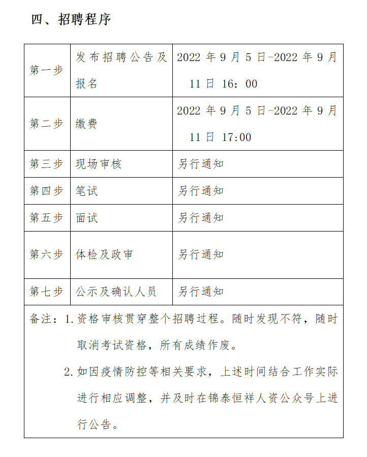 ?2022年9月5日-2022年9月11日16:00 在錦泰恒祥人資官網(wǎng)(www.jthxhr.com)、“錦泰恒祥人力資源服務(wù)有限公司”微信公眾號、“國控集團(tuán)”官方網(wǎng)站(m.worenzheng.com)及上級部門要求的相關(guān)網(wǎng)站等發(fā)布招聘公告。