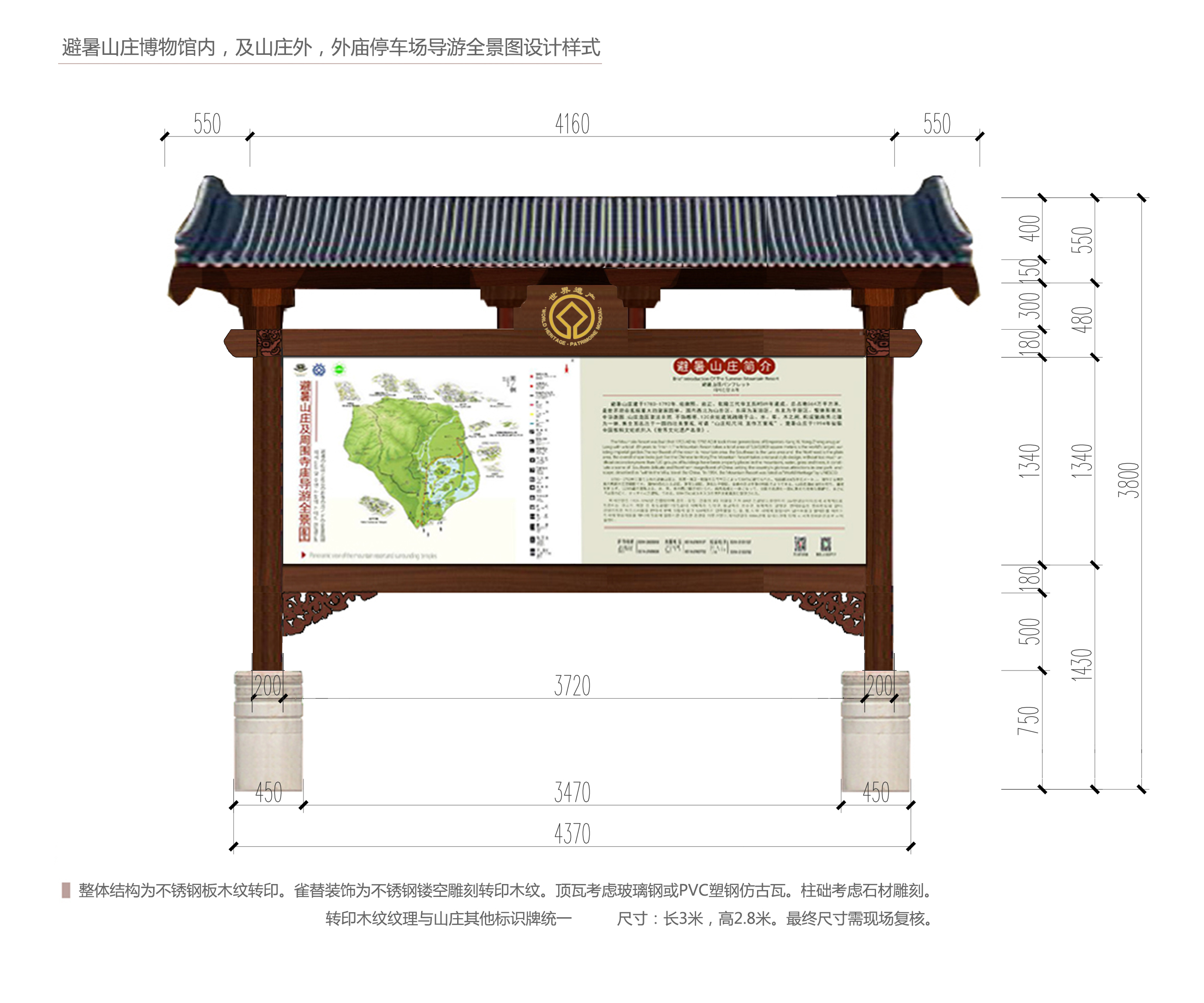 按照承德市人民政府辦公室印發(fā)的《避暑山莊及周圍寺廟景區(qū)整改提升專項(xiàng)工作方案》要求,在避暑山莊及周圍寺廟外5個(gè)停車場(chǎng)內(nèi),各設(shè)置景區(qū)導(dǎo)游全景圖1塊,由我公司邀請(qǐng)有資質(zhì)的單位進(jìn)行制作和施工,現(xiàn)將有關(guān)事項(xiàng)通知如下: